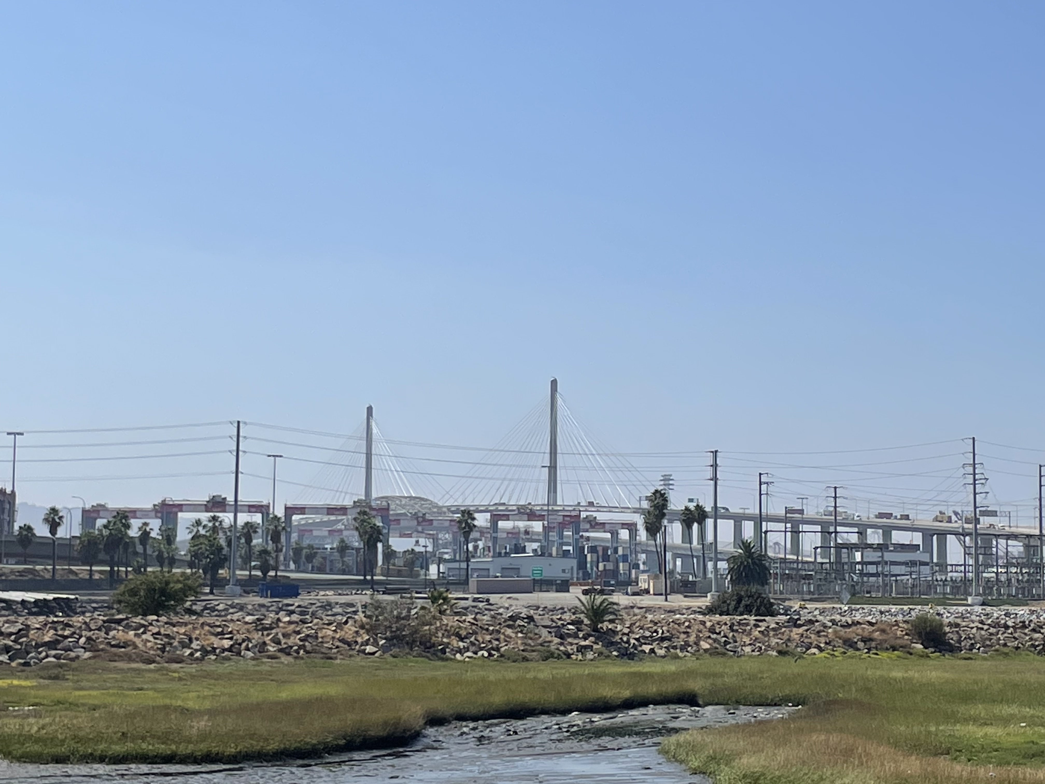 Once back in the car, there was only one right way to exit the city: the bridges. The most famous bridges in Los Angeles are the beautiful, art deco, downtown viaducts. The port of Los Angeles, however, is home to some impressive bridges oft forgotten. Right out of San Pedro, you can catch the Vincent Thomas Bridge. The forest green, classic suspension bridge connects San Pedro to Terminal Island. Once through the bridge, you find yourself on a few lanes of freeway traveling over the concrete island. Before long, the road ahead climbs into another bridge. The new Long Beach International Gateway replaced the old Gerald Desmond Bridge. The old bridge remains in place with the new bridge running alongside it for now. The new impressive cable-stayed bridge rises higher than the original. The only time you notice the old Desmond Bridge while driving is when the arch reaches just above the side wall.